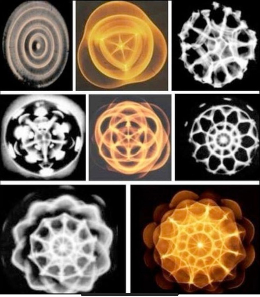 I have wondered if my association with sound and emotion and colour is a sort of synesthesia. I experience making sound as a synthesis of senses, a full somatic expression. Sound, colour, emotion. Why should we expect to experience one sense at a time in one body? There’s a lot written about it and certainly the colours I see in relation to parts of the body when I am doing this work or it is being done for me relate to chakra colours and ancient knowledge. So it’s not just me and I don’t think it’s just auto suggestion. I had these very specific colours and tones in relation to different areas of the body before I knew about the theory. When they come they are so intense internally it takes my breath away. They are deeply comforting and I emerge from a mediation or experience calm and changed somehow. It’s usually just one or two colours at a time and flashes and bursts of shapes related to natural forms like a complex flower or shifting geometry. Sacred geometric forms. I was reading about the work of Dr Hans Jenny as I journeyed down one of my rabbit holes the other day. Cymatics. He demonstrated the shapes and geometric patterns of sound in a series of visualised experiments. It caught my attention as the shapes he discovered through his research closely resemble the shapes and forms I see when I am in periods of creative flow.