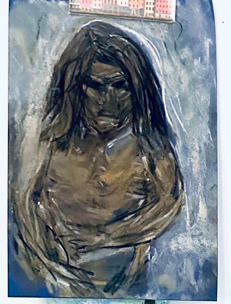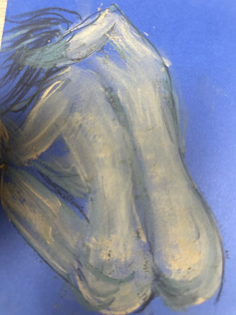 In other news my first monthly art subscription box, generously given by my colleagues, was hidden behind the bin when I got back on Wednesday. A box containing greytone charcoals and soft pressed dark green and mustard charcoal. And blue sketch paper. I have never used it before. Plus a booklet with some how to get started tips. It encouraged you to start with energetic lines representing rough shapes and movement. The green is shade and the mustard skin tone. I have never sketched on blue paper but it works very well. I got quite distracted by it once the kids were home, copying famous nudes for inspiration but, as the evening went on, they all turned into twisted versions of myself, and I think I drew four versions of me on the journey from sickness to health. Even if they started as someone or something else copied from the internet they turned into me. They are sad dark portraits of a closed sick body which gets lighter and more upright. It’s strange when you attempt to draw what comes out subconsciously. I was at it again in the night. They take the form of whatever comes out of my fingers. It finds me in the green and mustard chalk dust, broken and gnarled. Figuring out what’s broken or left behind. I feel like a snake that has shed many skins. I will keep going at this self portraits as therapy thing. It interests me. And when you have no intention to make it nice or good for anyone else the truth comes out.